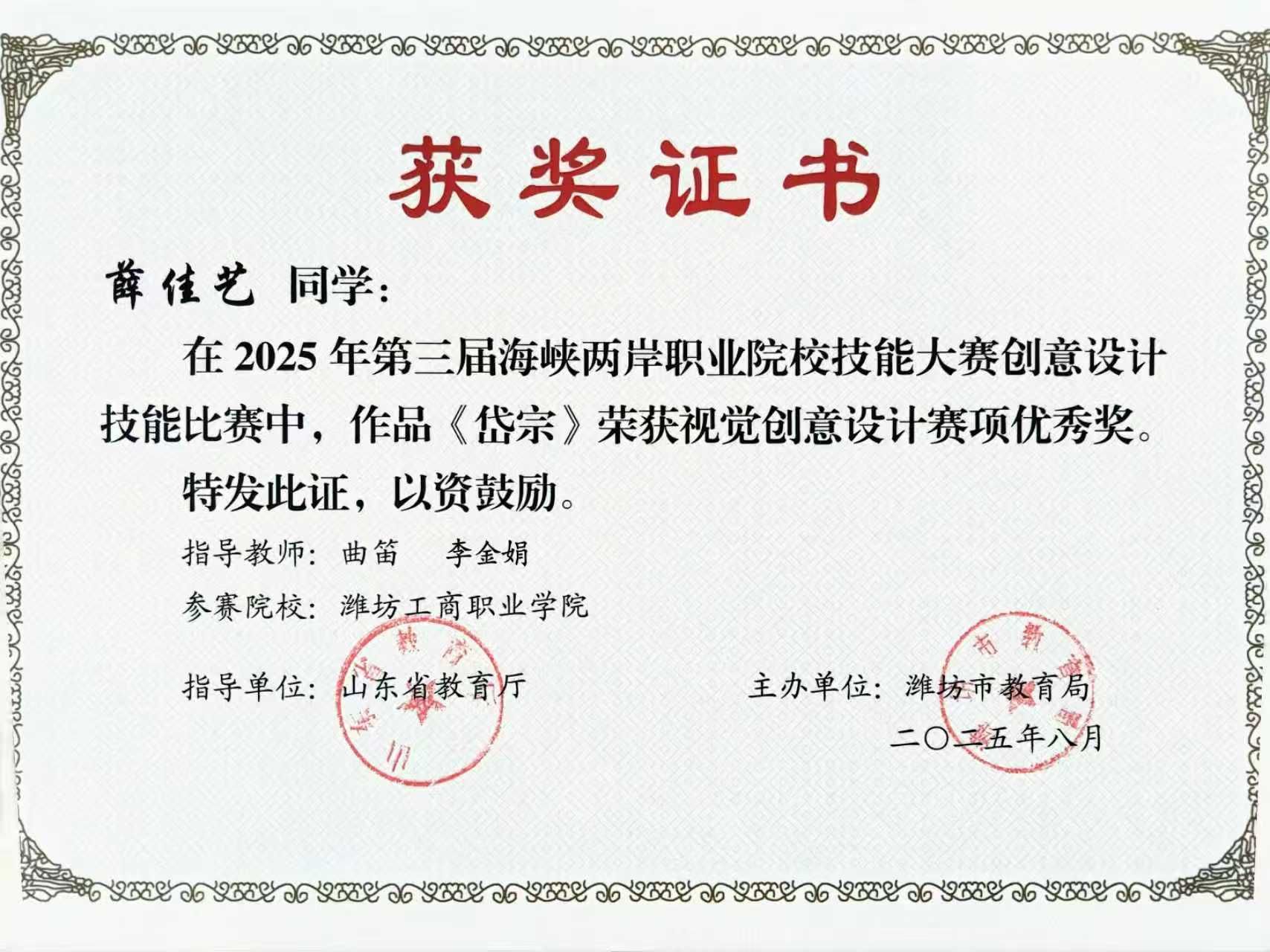 近日,2025年第三届海峡两岸职业院校技能大赛创意设计赛项评审结果公布。我校智能信息学院学生薛佳艺在指导教师曲笛、李金娟的悉心指导下,凭借作品《代宗》,在视觉创意设计赛项中荣获优秀奖。