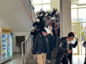 演练开始前,各班主任给学生介绍了简单的逃生注意事项和方法。随着警报的响起,学校应急疏散演练指挥部总指挥下达了请同学们立即撤离教学楼的命令。紧接着,各班主任老师迅速到达各班,协助上课老师一起组织学生疏散,其他老师们也在第一时间赶到自己当时所在楼层拐角处配合疏散学生。各班学生在老师们的指挥下,弯着腰,猫着步,用书挡住头部沿着学校指定楼梯口快速前进,有序撤离到安全地带。