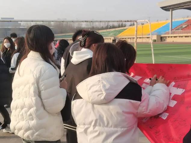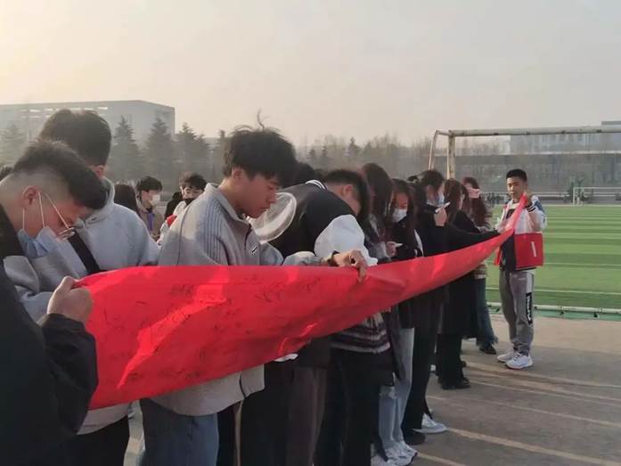 全体师生在“弘扬雷锋精神,做新时代好青年”的条幅上签字宣言。坚定理想信念、无私奉献、敢于创新、积极进取,通过开展学雷锋实践活动使同学们能更加深刻认识到雷锋精神的内涵,在服务他人的过程中提升自我,以实际行动弘扬雷锋精神。
