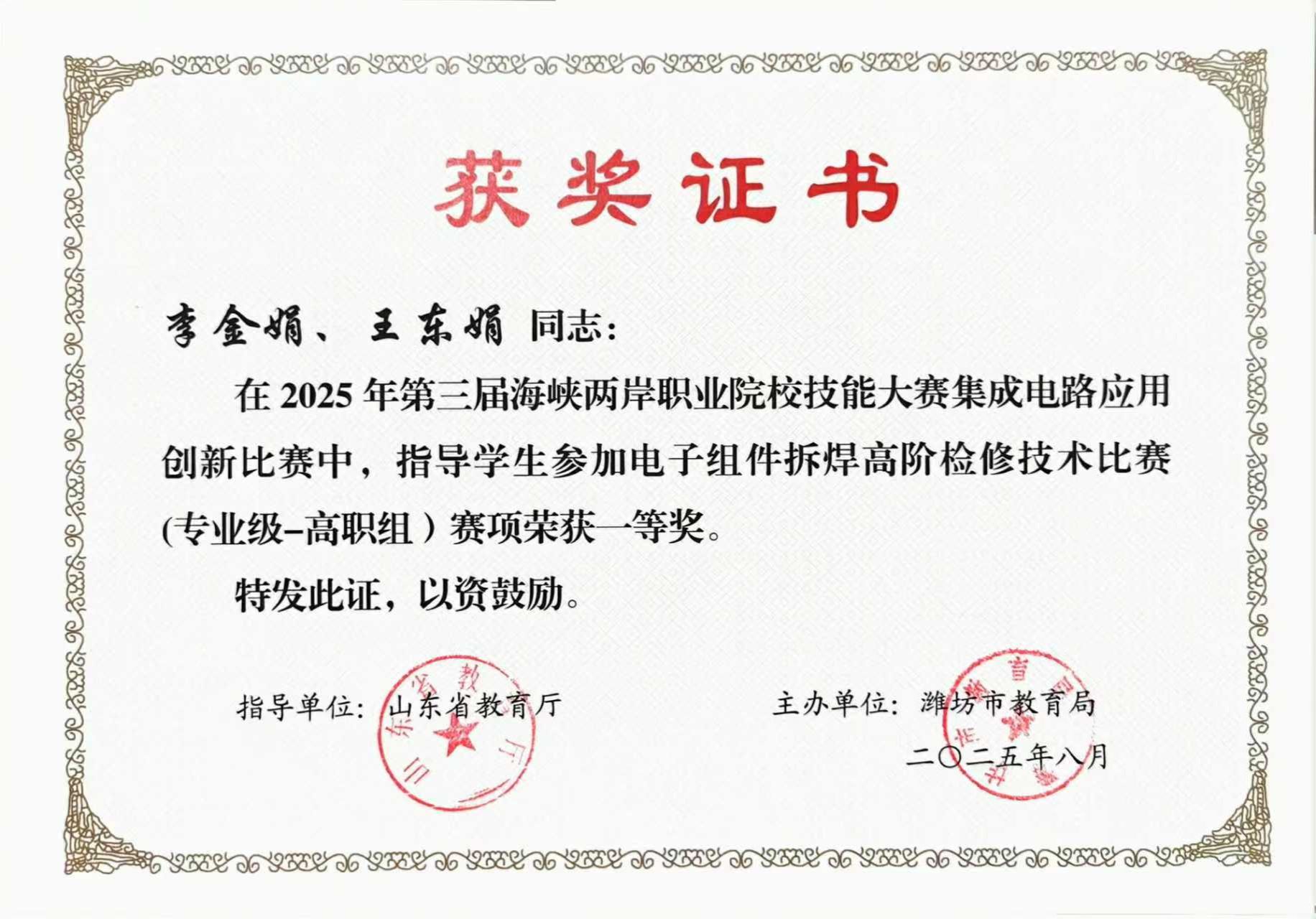 2025年第三届海峡两岸职业院校技能大赛集成电路应用创新赛项(专业级-高职组)比赛结果公布。我校教师李金娟和王东娟指导的学生团队,在电子组件拆焊高阶检修技术比赛中表现优异,荣获一等奖。