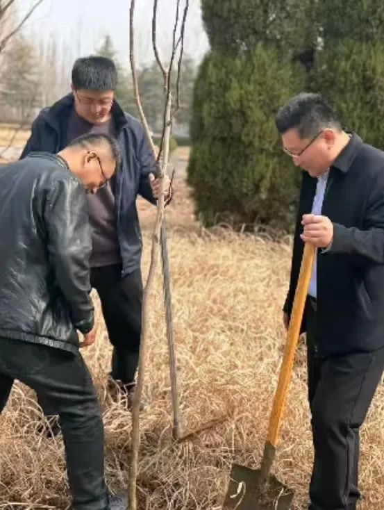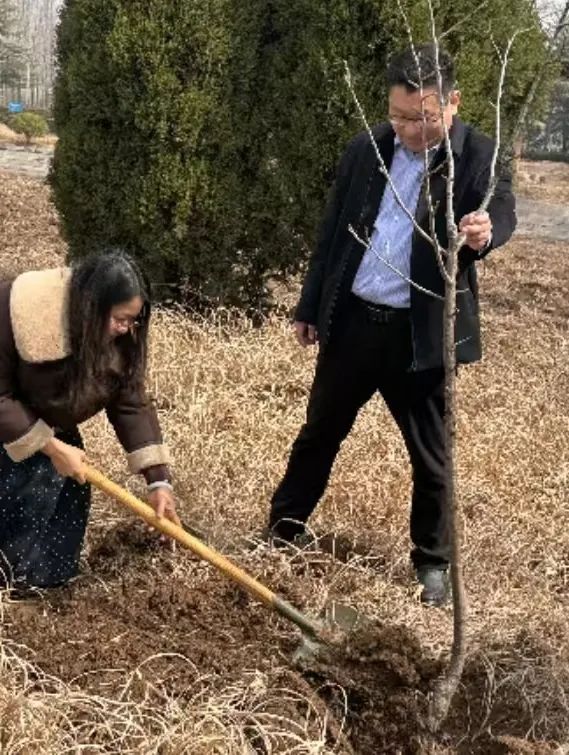 在尚智楼北侧绿化区,师生们分组协作,挥锹挖坑、扶苗填土、提水浇灌,共同种下桃树、玉兰、樱桃等树苗。尽管泥土沾满衣鞋,但现场欢声笑语不断。同学们纷纷表示:“亲手种下树苗,不仅为校园添绿,更感受到劳动的成就感”。