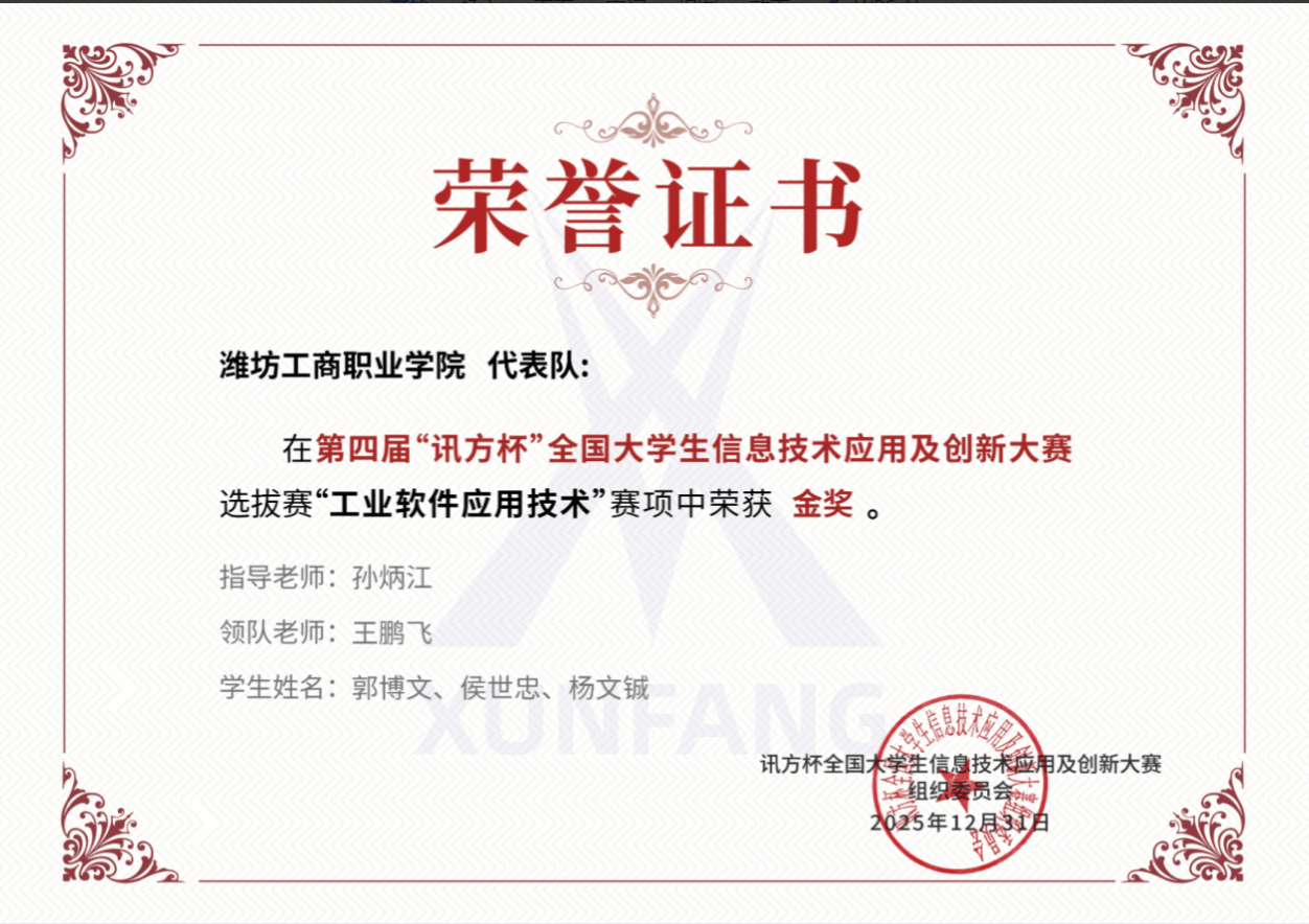 近日,在第四届“讯方杯”全国大学生信息技术应用及创新大赛中,潍坊工商职业学院智能信息学院两支队伍分获“工业软件应用技术”与“云(云计算&云服务)”赛项金奖,展现了学院在信息技术领域的教学实力。